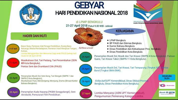 21-27 April : Bazar Buku, Pameran Alat Peraga Pendidikan, Ruang Baca Keluarga, Media Pembelajaran, Pameran Hasil Kerajinan Tangan, Kuliner, Lomba menggambar dan mewarnai bagi anak PAUD (setiap hari mulai tgl 22-26 April 2018)