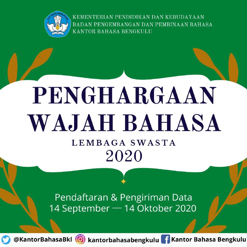 Kantor Bahasa Bengkulu mengadakan Penghargaan Wajah Bahasa bagi Lembaga Swasta. Pendaftaran dan pengumpulan data dibuka mulai tanggal 14 September — 14 Oktober 2020. Penghargaan akan diberikan kepada lima lembaga terbaik. Untuk memperoleh informasi lebih lengkap silakan tanyakan ke narahubung kegiatan.