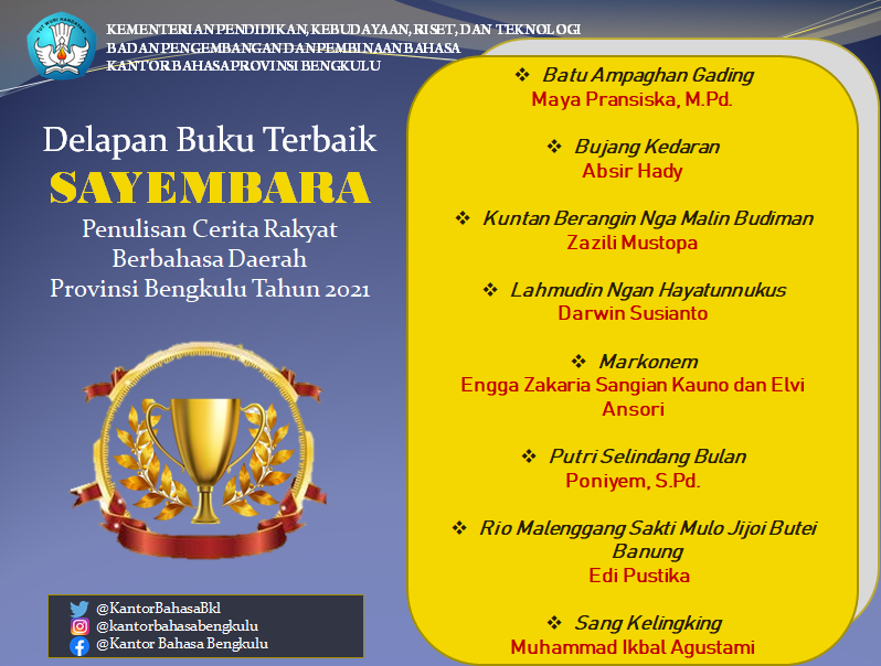 Kantor Bahasa Provinsi Bengkulu telah menetapkan delapan buku terbaik hasil Sayembara Penulisan Cerita Rakyat Berbahasa Daerah Tahun 2021. Dewan juri kegiatan ini adalah Drs. R. Ade Hapriwijaya, Ira Diana, M.Pd., dan Dr. Junaiyah H. Matanggui, M.Hum. Selamat kami ucapkan kepada para penulis buku terbaik dan mohon menghubungi panitia untuk informasi selanjutnya.