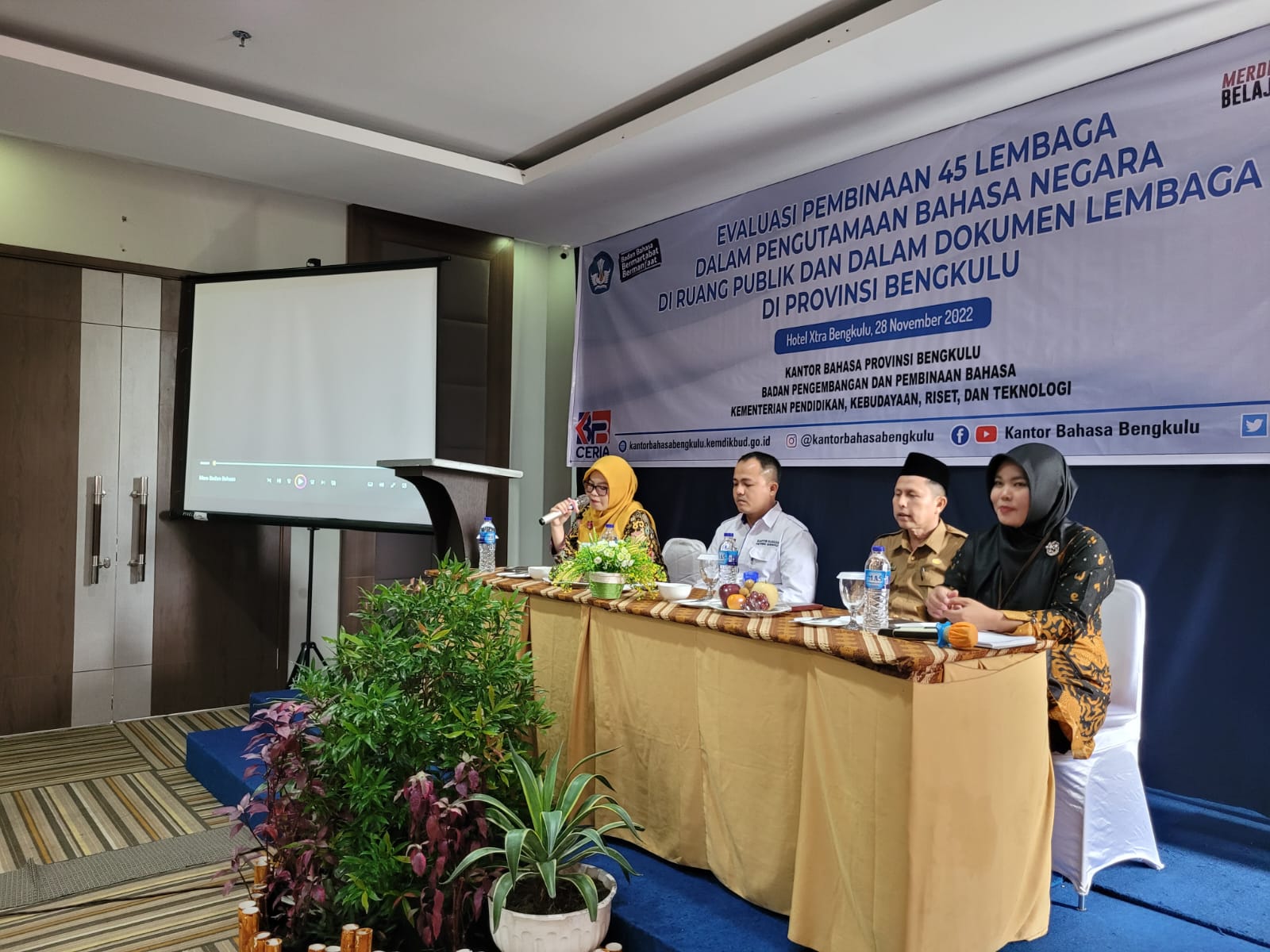 Bengkulu–Kantor Bahasa Provinsi Bengkulu melaksanakan kegiatan “Evaluasi Pembinaan 45 Lembaga dalam Pengutamaan Bahasa Negara di Ruang Publik dan dalam Dokumen Lembaga di Provinsi Bengkulu ” pada 28 November 2022 di Hotel Xtra Kota Bengkulu. Kegiatan dibuka oleh Koordinator Tata Usaha, Mariam Tomy, S.E., M.Ak. Kegiatan ini dilakukan untuk mengevaluasi program pembinaan pengutamaan bahasa negara di ruang publik dan dalam dokumen negara di 45 lembaga pada tahun 2022.