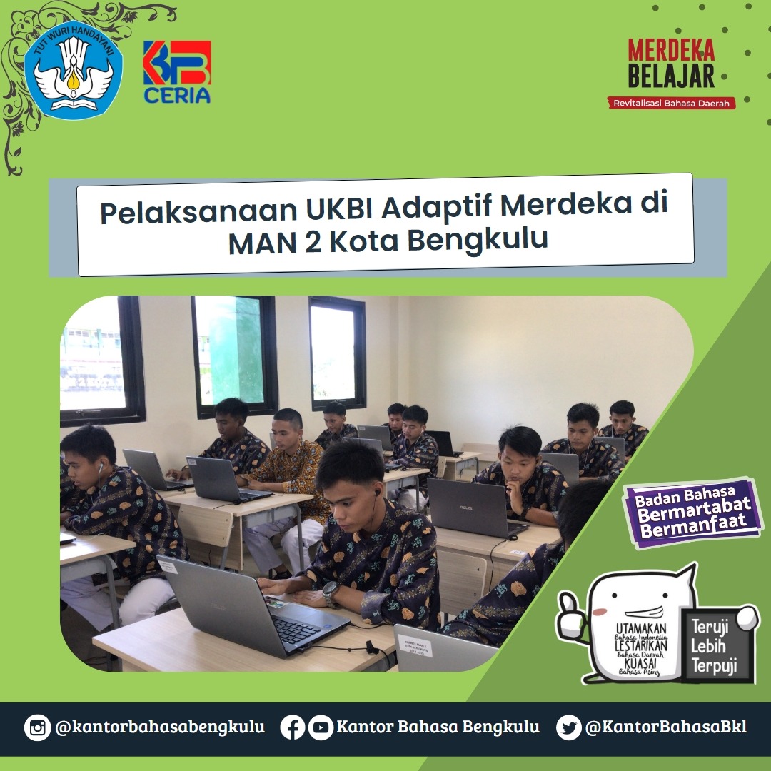 Jalinan Media–Kamis, 19 Januari 2023, Tim KKLP UKBI Kantor Bahasa Provinsi Bengkulu, Melda Herlita, S.Pd., dan Selly Farazia, S.Pd., melakukan pendampingan pelaksanaan UKBI Adaptif Merdeka di MAN 2 Kota Bengkulu. Pengujian telah dilakukan selama tiga hari dalam dua sesi, yakni pukul 8.00—9.40 WIB dan sesi II pada pukul 10.00—11.40 WIB. Alur pelaksanaan UKBI ini didahului dengan pelaksanaan Sosialisasi dan Pendampingan Pendaftaran pada hari Senin, 16 Januari 2022.