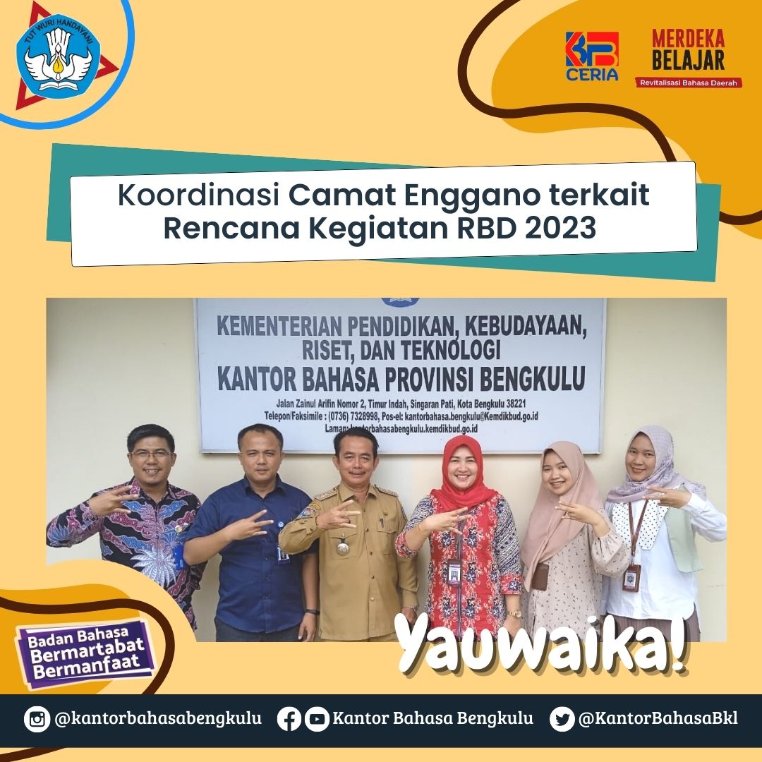 Kunjungan ini dilakukan berkaitan dengan rencana Kantor Bahasa Provinsi Bengkulu yang akan melaksanakan observasi tempat pelaksanaan kegiatan RBD Enggano di Pulau Enggano yang puncaknya akan dilaksanakan pada Bulan November mendatang. Camat Enggano menginisiasi pertemuan ini agar terjalin komunkasi yang baik dan jelas antara masyarakat Enggano sebagai pelaku tutur bahasa Enggano dengan Kantor Bahasa selaku pelaksana seluruh rangkaian kegiatan RBD tahun 2023.