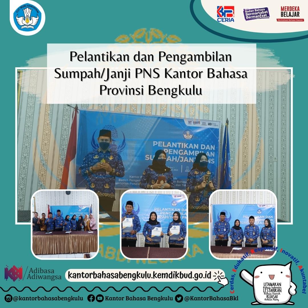 Bengkulu, 1 Maret 2023– Setelah hampir satu tahun mengabdikan diri dan menjalankan tugas sebagai pengkaji bahasa dan sastra di Kantor Bahasa Provinsi Bengkulu, tiga CPNS atas nama Jimmy Hendarta, S.S., Riqqah Dhiya Ramadhanty, S.Pd., dan Selly Farazia, S.Pd., hari ini, Rabu, 1 Maret 2023, pukul 11.30 WIB resmi dilantik menjadi ASN di Kantor Bahasa Provinsi Bengkulu, Kementerian Pendidikan, Kebudayaan, Riset, dan Teknologi.