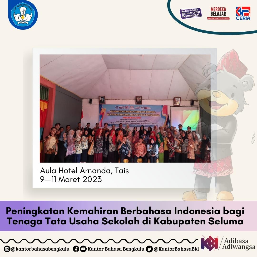 Jalinan Media– Kantor Bahasa Provinsi Bengkulu melaksanakan kegiatan pembinaan bahasa Indonesia di Kabupaten Seluma dengan sasaran kegiatan adalah Tenaga Tata Usaha Sekolah semua jenjang pendidikan. Kegiatan yang berlangsung sejak tanggal 9—11 Maret 2023, di Hotel Arnanda ini dibuka secara resmi oleh Asisten Adminstrasi Umum, Sekretariat Daerah Kabupaten Seluma, Bapak Riduan Sabrin, S.T..