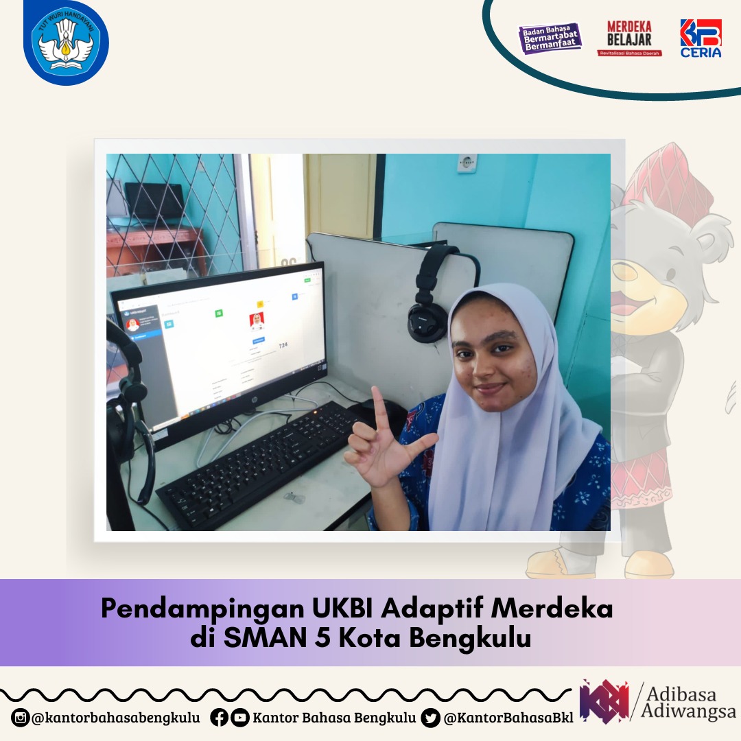 Kamis, 15 Maret 2023, Tim KKLP UKBI Kantor Bahasa Provinsi Bengkulu, Melda Herlita, S.Pd., dan Selly Farazia, S.Pd., melakukan pendampingan pelaksanaan UKBI Adaptif Merdeka di SMA Negeri 5 Kota Bengkulu. Pengujian ini diikuti oleh seluruh siswa kelas XII SMA Negeri 5. Pengujian dilaksanakan selama tiga hari, 15–17 Maret 2023.