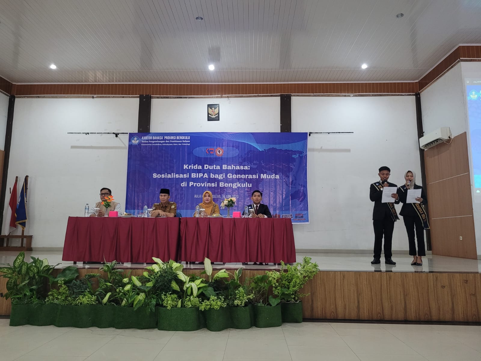 Jalinan Media- Dalam upaya meningkatkan fungsi bahasa Indonesia menjadi bahasa internasional sesuai amanat undang-undang, Badan Pengembangan dan Pembinaan Bahasa melaksanakan program pembelajaran Bahasa Indonesia bagi Penutur Asing (BIPA). Sejalan dengan itu, Duta Bahasa Provinsi Bengkulu sebagai mitra Kantor Bahasa Provinsi Bengkulu ikut serta menjalankan program interasionalisasi bahasa Indonesia dengan melaksanakan Krida Duta Bahasa dengan tema: Sosialisasi BIPA bagi Generasi Muda di Provinsi Bengkulu pada Senin (19/5). Kegiatan ini dilaksanakan di Aula Hotel Adeeva, Kota Bengkulu.